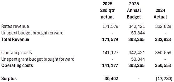 3. An annual budget of $9,000 for Community Grants, including $5,000 for the Waihemo Heritage Trust. Unspent balances are carried forward until spent, and $29,853 has been added from 2023-24, providing $38,853 for the 2024-25 financial year.