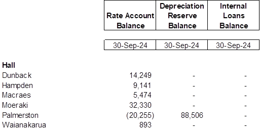 The table below lists the balances of separate rate accounts relating to community halls within the Waihemo ward at 30 September 2024.